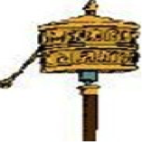 Tibetan Prayer Wheels: “devices for spreading spiritual blessings and well being. Rolls of thin paper, imprinted with many, many copies of the mantra (prayer) Om Mani Padme Hum… are wound around an axle in a protective container, and spun around and around. Tibetan Buddhists believe that saying this mantra, out loud or silently to oneself, invokes the powerful benevolent attention and blessings of Chenrezig, the embodiment of compassion.” (from the prayer wheels)