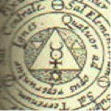 Astrological Chart: used by medieval alchemists in divination. Notice the symbol of the intellect and of the planet (and Roman god) Mercury inside the center triangle. This triangle is surrounded by a hexagram and two smaller triangles positioned as male and female energy – and seven more concentric circles. Compound symbols within magical codes and names inside multiple circles have been used by occultists and sorcerers in many parts of the world. It is still used in African witchcraft