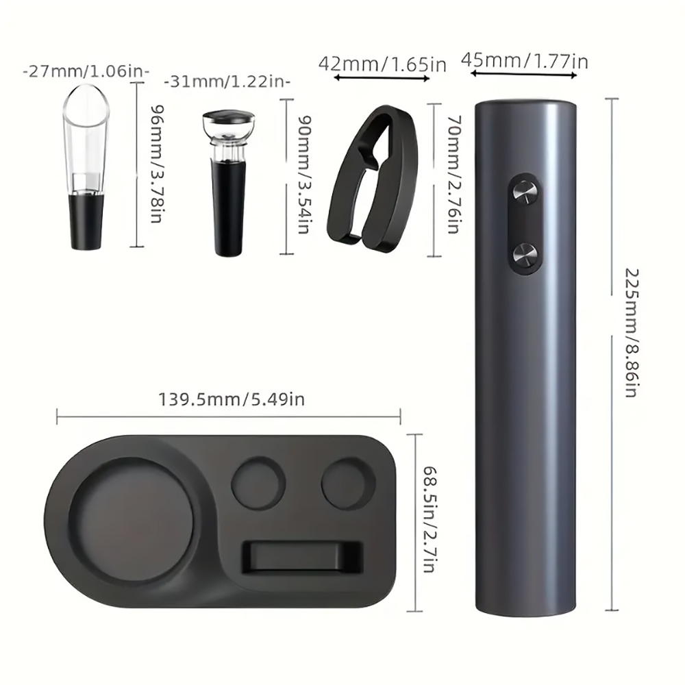 Elevate your wine experience with this sophisticated 5-in-1 electric wine opener set. This comprehensive collection includes an automatic bottle opener that effortlessly removes corks at the touch of a button, paired with a precise foil cutter for a clean, professional bottle opening. The set features a vacuum wine preserver to maintain your wine’s freshness, alongside an elegant pourer that ensures smooth, drip-free serving. All components nest neatly in the included storage base, keeping your wine accessories organized and readily accessible. The automatic opener operates on dry batteries, eliminating the need for charging cables. This set combines convenience with style, whether for personal use or as a thoughtful present for wine enthusiasts. The ergonomic design ensures comfortable handling, while the sleek appearance adds a touch of sophistication to any wine service. Perfect for both casual wine drinkers and connoisseurs alike, this versatile set enhances every aspect of wine enjoyment, from opening to serving and preserving.