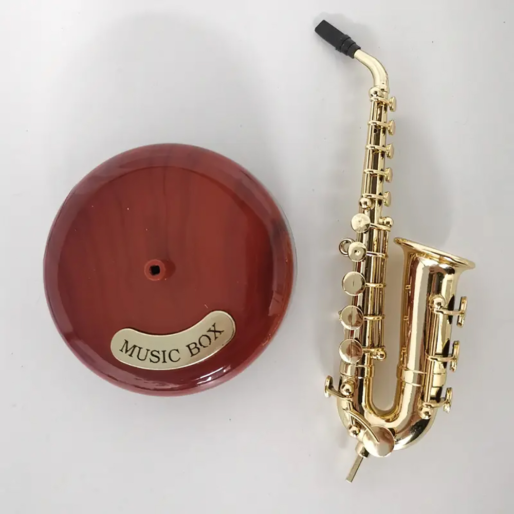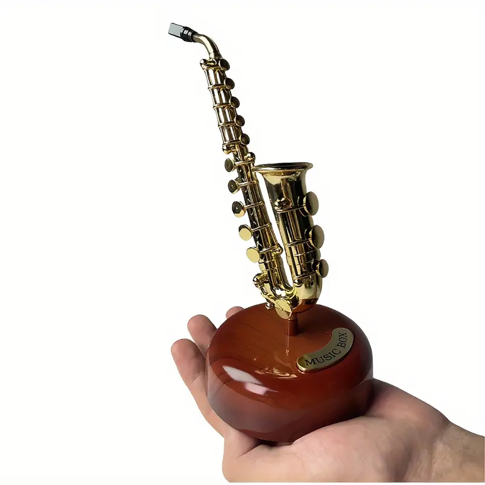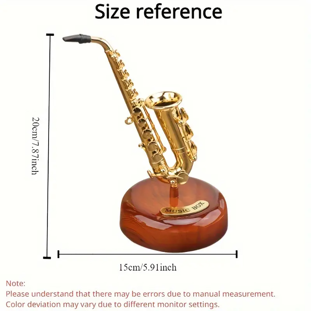 - DESIGN FEATURES: Vintage-style saxophone music box with wind-up rotating mechanism, crafted with ABS material and dark wood base for elegant display